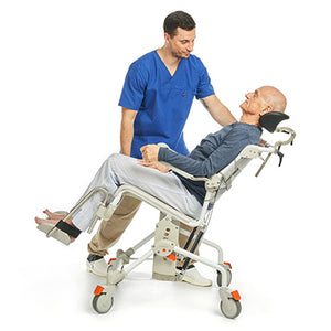 Unique tilt feature gives increased security for user and an ergonomic working position for the caregiver. Tilt angle is -5° to +35° and can be operated from either side of the chair.
